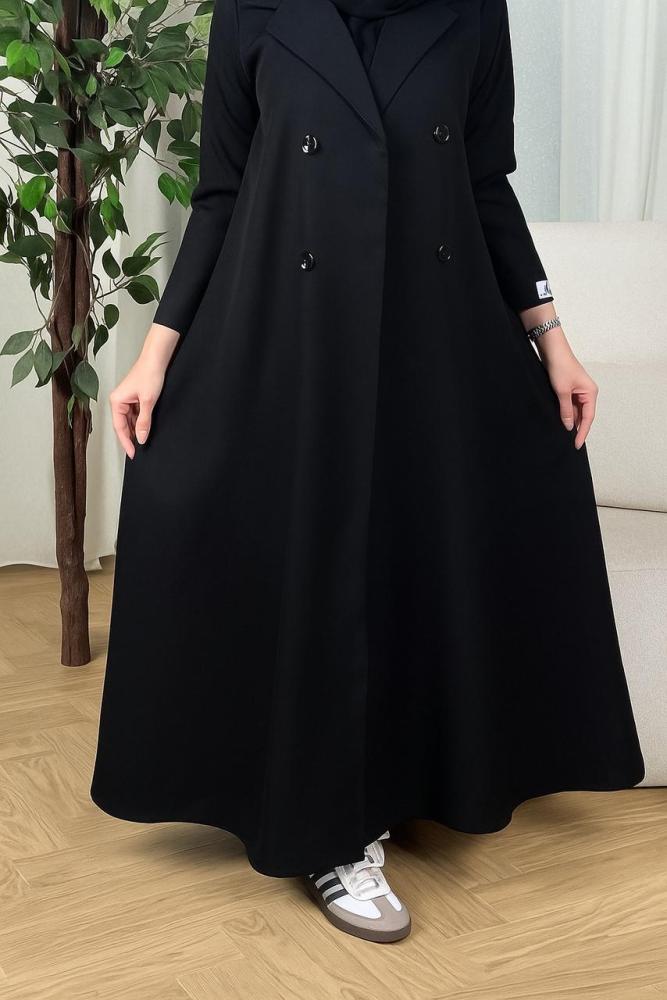 عبايات سوداء بأزرار من ثري - Thari تجمع بين الأناقة العملية والتصميم العصري قماش كرب لمار واقف يعطيها شكل مميز وقصة بليزر كوت تضفي عليها طابع رسمي يناسب كل المناسبات المختلفة بأناقة وجاذبية مستمرة طوال اليوم
